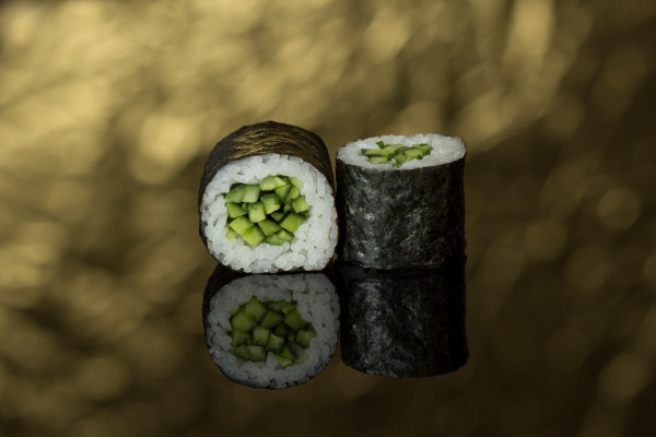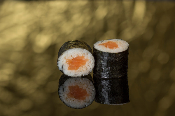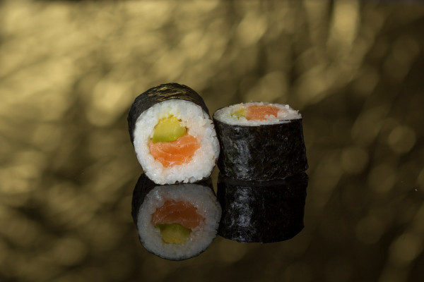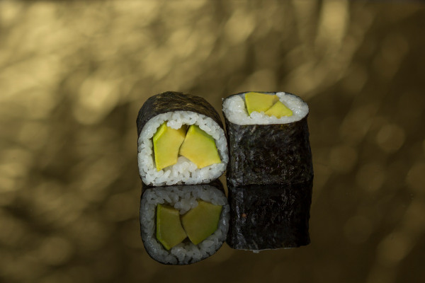 אורז, נורי, סלמון, אבוקדו ושומשום.