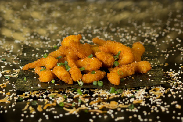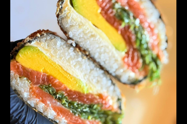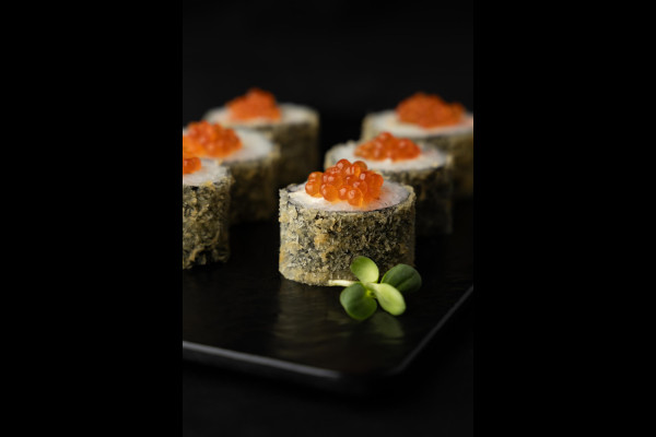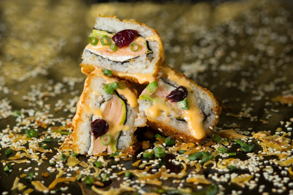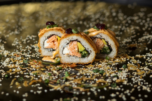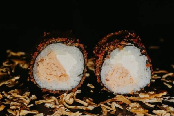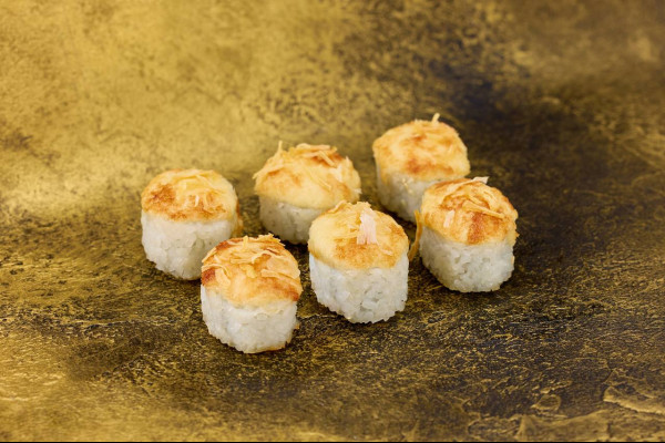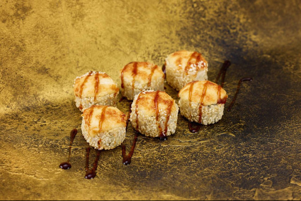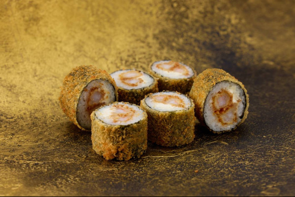 Рис, нори, запеченный лосось, крем-чиз, обжаренный в темпуре.