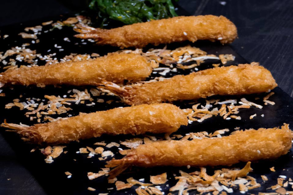 Рис, нори, креветка в темпуре, крем чиз обжаренный в темпуре.