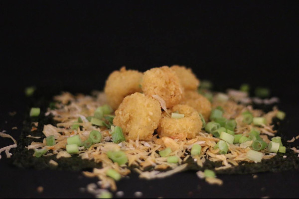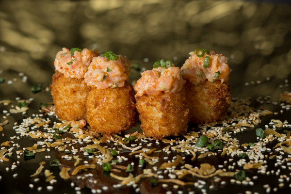Рисовые шарики(4 штуки),сыр бри,обжаренные в темпуре.Тар-тар из лосося(с/с лосось,огурец,сладкий перец,лук,икра тобико,японский майонез).