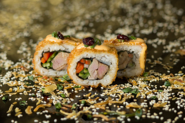 Рис,нори,запеченный тунец,сладкий перец,огурец,зеленый лук,клюква,обжаренный в темпуре.
