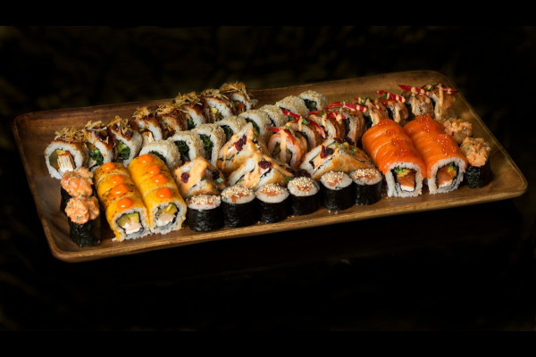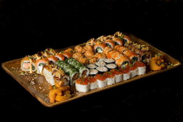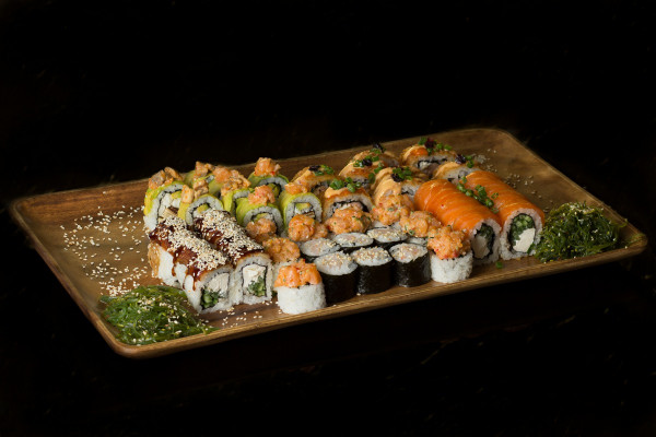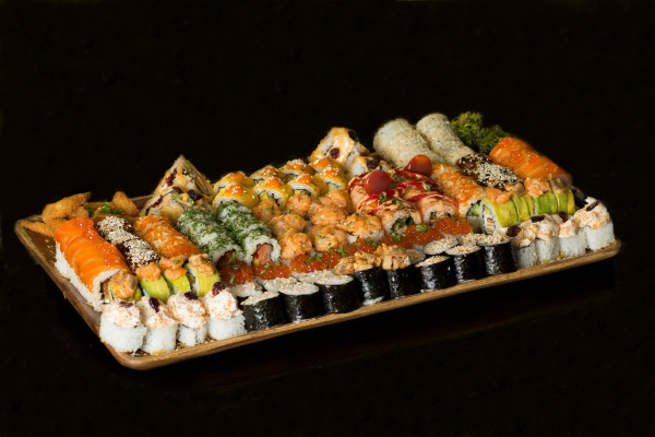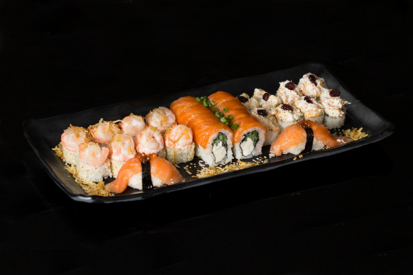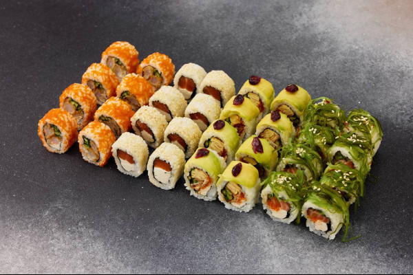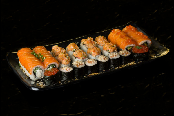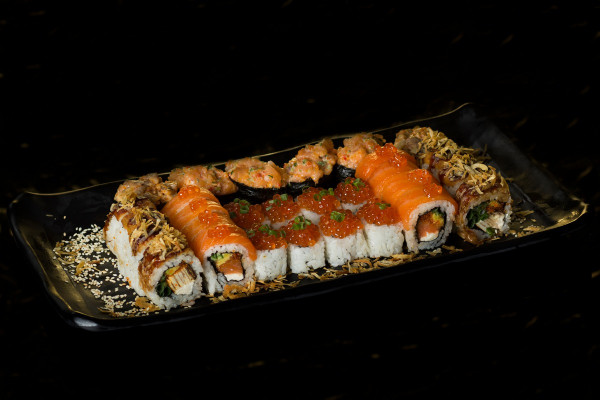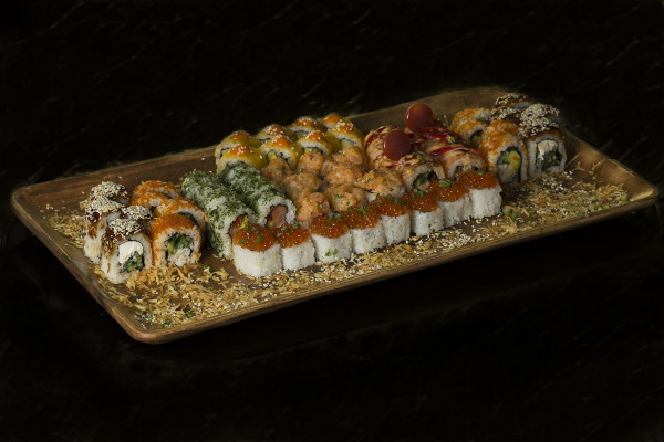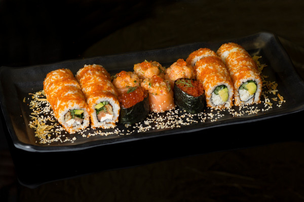Mega caviar, Tar-tar roll ,Shrimps boom, Brie roll, Fila Sunshine, California crab, Kamikadze.